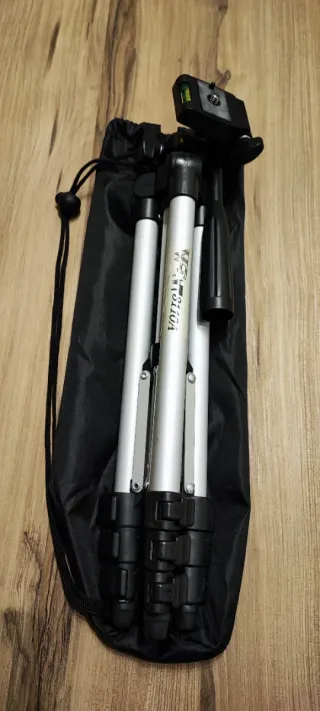 Trípode universal. 85cm de altura. En buen estado. - Patas ajustables de aluminio. - Cabezal con nivel de burbuja. - Incluye funda de transporte negra.