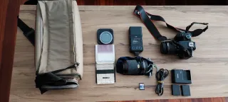 Kit de cámara digital Canon EOS 1100D con accesorios. - Cuerpo de cámara Canon EOS 1100D. - Objetivo. - Flash externo. - Baterías y cargador. - Tarjeta de memoria. - Filtros. - Bolsa de transporte.