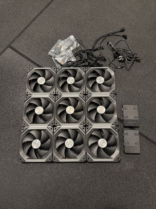 Pack de nueve ventiladores Lian Li Unifan SL120 v1. - Conexión en cadena para un montaje limpio. - Iluminación RGB personalizable. Alimentacion: - Ventilador DV12V - LEDs DC5V Velocidad; 1900RPM Airflow; 58.54CFM Air Pressure 2.54mm H2O Ruido; 31.db a maxima potencia. Se envian con todo el cableado y 3 HUBs. IMPORTANTE!! Algunos LEDs pueden verse amarillos con configuraciones azules, pero es problema del producto, incluso reportado por el fabricante para modelos nuevos. VER FOTO Incluyo 3 HUBs porque no se si funcionan y testearlos me implica desmontar toda la torre