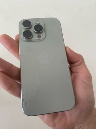 Teléfono móvil iPhone 16 Pro en color plata y con 128GB de almacenamiento. - Pantalla de 6.1 pulgadas. - Sistema de triple cámara trasera. - Acabado en cristal y metal. -Cristal trasero roto y panyalla un poco rallada