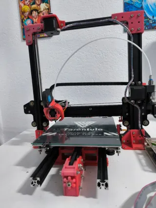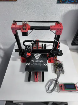 Impresora 3D con estructura en negro y detalles en rojo. - Plataforma de impresión. - Sistema de extrusión. - Marco de soporte. Solo falla la calefacción de la cama por llevar mucho parada, seguramente se soluciona rehaciendo soldadura.