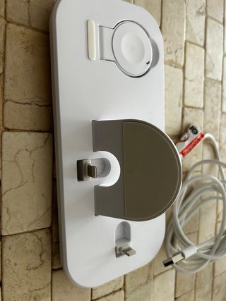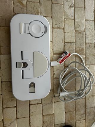 Base de carga blanca para iPhone y Apple Watch. Permite cargar ambos dispositivos simultáneamente. - Soporte para Apple Watch. - Conector Lightning para iPhone. - Puerto USB adicional.