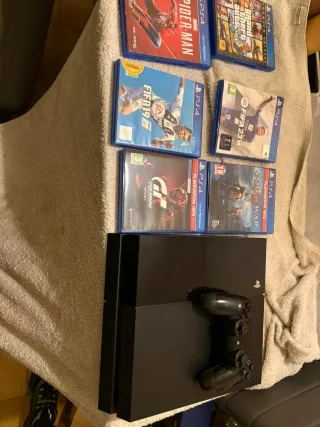 Se vende consola PlayStation 4 en color negro, junto con cinco videojuegos. - Juegos incluidos: Grand Theft Auto V, FIFA 23, God of War, Spider-Man, FIFA 19 y Gran Turismo Sport. - Incluye mando. (caldes de montbui)