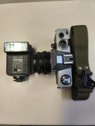 Cámara réflex analógica Praktica TL 1000 con flash Hanimex 325AZ. - Cuerpo de cámara plateado y negro. - Pila de boton nueva. - Incluye flash externo Hanimex. - Correa de sujeción incluida. - Funciona perfectamente.