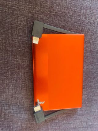 Powerbank de color naranja con un diseño moderno y compacto. Incluye cables integrados para mayor comodidad. - Cable Lightning integrado. - Cable USB-C integrado. Es de unos 5000mAh