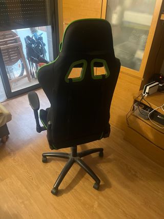 Silla de gaming con un diseño ergonómico y deportivo. - Tapicería negra con detalles en verde. - Reposacabezas y cojín lumbar incluidos. - Base con ruedas para fácil movilidad.