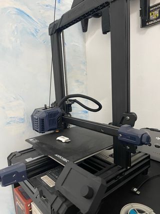 Impresora 3D Anycubic Kobra Neo en color negro y azul. Es un modelo de escritorio con una base de impresión amplia. - Plataforma de impresión de Anycubic. - Incluye un pequeño dispositivo USB.