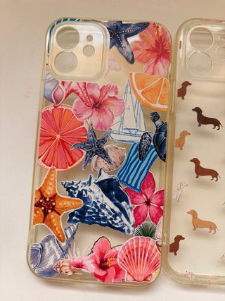 Pack de tres fundas para iPhone 12. - Funda con diseño de temática marinera y conchas. - Funda transparente con estampado de perros salchicha. - Funda transparente con flores secas incrustadas. Están un poco amarillas