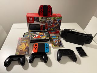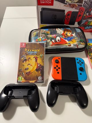 Consola Nintendo Switch edición especial Super Mario Odyssey. - Incluye consola, Joy-Con rojos y azules. - Base de carga y cables. - Juego Super Mario Odyssey. - Juego Rayman Legends. - Juego Crash Bandicoot N. Sane Trilogy. - Funda de transporte. - Mando Pro Controller. - Empuñaduras para Joy-Con.