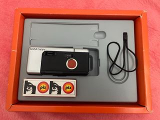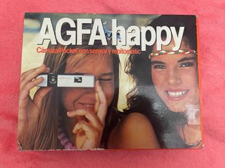 Cámara fotográfica vintage Agfa Happy Pix, un modelo clásico para coleccionistas. - Diseño compacto en color plata y negro. - Incluye correa. - Presentada en su caja original con accesorios. -carretes sin abrir