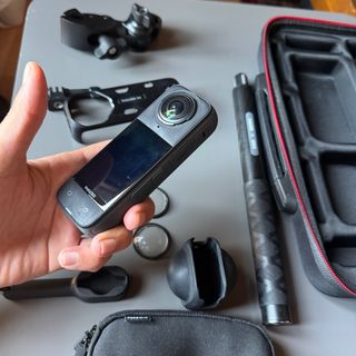Cámara Insta360 X4 con accesorios. - Cámara de 360 grados. - Incluye funda protectora. - Varios accesorios adicionales. Viene con su caja y en la lente delantera y trasera un protector que se ve en la foto