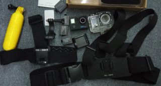 cámara tipo GoPro, con caja e instrucciones. Incluye todos los accesorios más funda sumergible con recamvio de puerta trasera. Cámara acuatica hasta 10 metros.