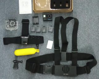 Cámara de deportes con accesorios para tus aventuras. - Incluye carcasa sumergible. - Flotador amarillo para actividades acuáticas. - Ventosa para montaje. - Correa para cabeza. - Estuche de transporte.