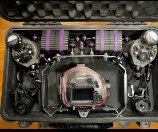 Equipo completo para fotografía submarina. - Carcasa de cámara transparente. - Dos luces de buceo. - Soporte y brazos articulados. - Estuche de transporte. Costo en su dia de 4000 euros con camara olympus