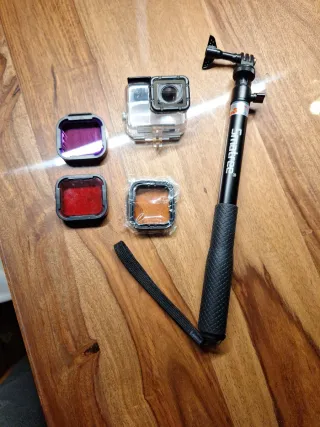 Funda impermeable para GoPro Hero 5, 6 y 7. Incluye varios filtros de color y un palo selfie. Está impoluta - Funda de buceo transparente. - Filtro de color púrpura. - Filtro de color rojo. - Filtro de color naranja.