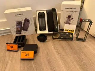 Se vende cámara de acción Insta360 X4 8K junto con varios accesorios. - Cámara Insta360 X4 8K. - Caja original. - Funda de buceo invisible. - Cargador triple para baterías. - Dos baterías Vemico X4. - Soporte metálico. - Marco protector para la cámara.