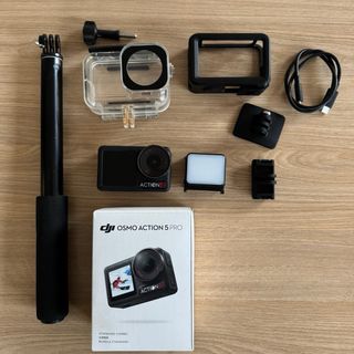 Cámara de acción DJI Osmo Action 5 Pro en color negro. Incluye accesorios. El kit de buceo incluye un estuche de buceo, un palo selfie extendido, un estuche para exteriores, una batería, un estuche protector para exteriores y un parche para casco. El dispositivo está en perfecto estado e incluye todos los accesorios originales.
