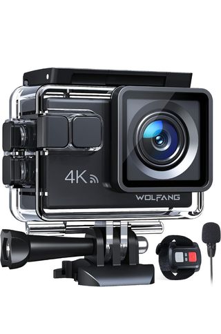 WOLFANG Cámara Deportiva GA100 4K 30FPS, Videocámara de Casco WiFi de 20MP con EIS Antivibración, Cámara Subacuática Buceo 40M con Micrófono Dual, Control Remoto, Varios Accesorios. No lleva batería.