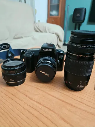 Cámara réflex analógica Canon EOS 1000FN con lente zoom. - Incluye lente Canon Zoom EF 35-80mm 1:4-5.6 I. Vendo la cámara completa con los dos lentes uno de 75-300 el otro 28mm. Esta todo junto en la foto precio 220eu. Camara sola 80eu