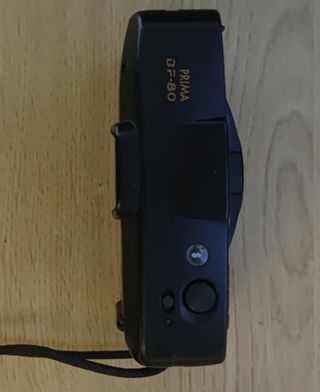 Cámara de fotos analógica Canon Prima BF-80. Funciona con dos pilas AA. Tiene temporizador, autopase de fotos, contador y objetivo con cierre. Algunas pequeñas rayitas en el objetivo, pero no se aprecian al mirar por el visor.