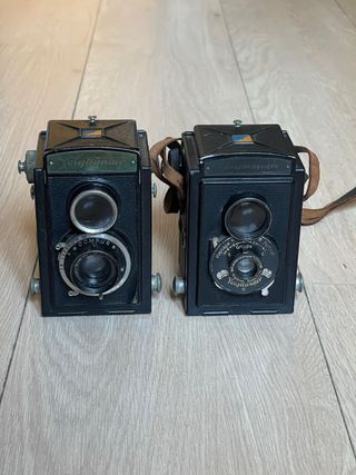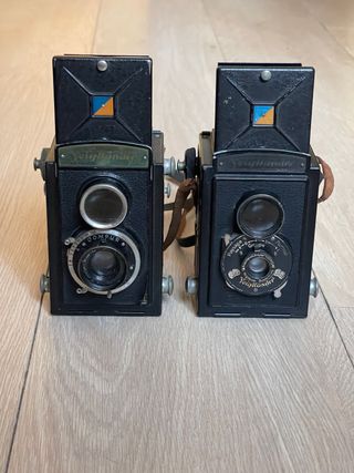 Lote de dos cámaras analógicas pseudo TLR Voigtlander Brillant y Brillant V6. Ambas fabricadas en los años 30. Cuerpo de metal, visor de cintura y velocidades y aperturas seleccionables. En muy buen estado estético, una no parece funcional; la V6 parece funcional pero creo que falla en velocidades bajas. Visores limpios y funda original de cuero en buen estado incluida Camara, camaras, analogica, analogicas, pack, lote, oferta, piel, estuche, funda, clasica, clasicas, foto, fotos, fotografo, fotografia, antigua, antiguas, coleccion, coleccionismo, coleccionistas, antigüedad, antigüedades, original, originales, vintage, retro