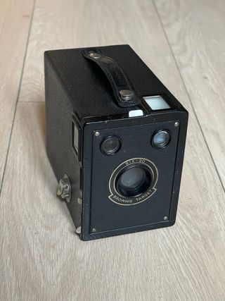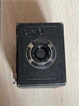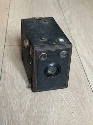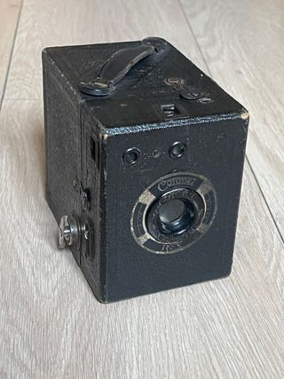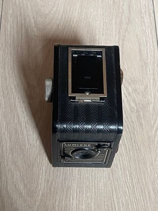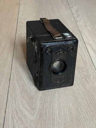Cámara de caja fabricada en los años 50. Utiliza película 120. Lente de foco fijo con apertura de ~f/11. Velocidades instantánea y B (bulb). Visor en la parte superior. En muy buen estado estético, asa superior rota. Totalmente funcional. cámara, cámaras, analógicas, bobina, film, antigua, antiguas, antigüedad, coleccion, coleccionismo, coleccionista, pack, lote, oferta, vintage, retro, pelicula, fotografia, fotos, foto, fotografo, profesional, original, originales, clásica, clásicas, fotógrafos, analógica