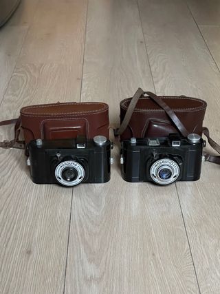 Cámara analógica miniatura fabricada en los años 50 en Japón. Tiene distintas velocidades (B, 1/25, 1/50 y 1/100) y distintas aperturas para seleccionar. Utiliza película de 17,5mm. En perfecto estado estético y de funcionamiento, con funda original de cuero incluida también en muy buen estado. Con una bobina original. cámara, cámaras, analógicas, film, antigua, antiguas, antigüedad, coleccion, coleccionismo, coleccionista, pack, lote, oferta, vintage, retro, fotografia, fotos, foto, fotografo, clásica, clásicas, analógica, funda, estuche, cuero, piel, mini, micro, espía, pequeña, miniatura, guerra, japonesa