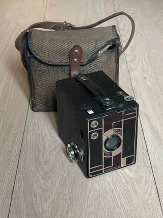 Cámara de caja fabricada en los años 30. Utiliza película 127. Tiene velocidad instantánea, modo B y bloqueo del disparo. En perfecto estado estético y de funcionamiento. Incluye una bobina de 127 en el interior. cámara, cámaras, analógicas, bobina, film, antigua, antiguas, antigüedad, coleccion, coleccionismo, coleccionista, pack, lote, oferta, vintage, retro, pelicula, fotografia, fotos, foto, fotografo, profesional, original, originales, clásica, clásicas, fotógrafos, analógica, funda, estuche, cuero, piel