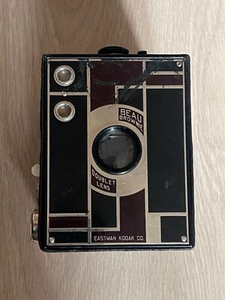 Cámara de caja Kodak n2 Beau Brownie, fabricada en los años 30 en Nueva York. Panel frontal de metal con estilo Art Deco. Utiliza película 120. Lente Kodak Doublet de foco fijo. Dos velocidades: instantánea y B, y apertura seleccionable. Visores limpios, frontal con alguna marca (ver fotos). Funcional en ambas velocidades. Con funda de tela. cámara, cámaras, analógicas, bobina, film, antigua, antiguas, antigüedad, coleccion, coleccionismo, coleccionista, pack, lote, oferta, vintage, retro, pelicula, fotografia, fotos, foto, fotografo, profesional, original, originales, clásica, clásicas, fotógrafos, analógica, funda, estuche