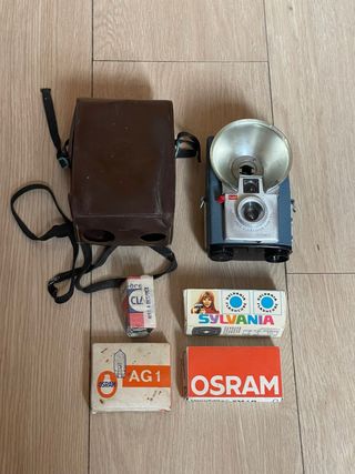 Cámara analógica compacta fabricada en los años 50, en color azul. Utiliza película 127, las bobinas no están incluidas. El obturador funciona, tiene una sola velocidad y dos aperturas. En buen estado estético. Incluye la funda y un lote de 4 cajas de bombillas de distintas marcas. cámara, cámaras, analógicas, bobina, film, antigua, antiguas, antigüedad, coleccion, coleccionismo, coleccionista, pack, lote, oferta, vintage, retro, pelicula, fotografia, fotos, foto, fotografo, profesional, original, originales, clásica, clásicas, fotógrafos, analógica, funda, estuche, cuero, piel, compacta, compactas, caja, cajón, box