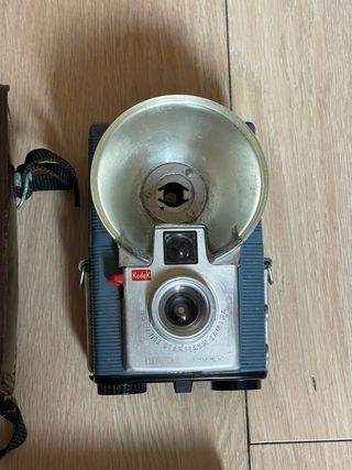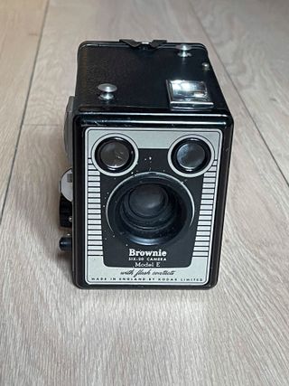 Cámara de caja analógica con contactos para flash. Fabricada en Inglaterra en los años 50. Utiliza película 620. Pestaña para el filtro (lo conserva) y otra deslizable que permite enfocar a distancias cortas. Dos velocidades: instantánea y B. Incluye contacto de dos pines para flash, entrada para cable disparador y roscas para trípode. En muy buen estado estético y funcional en ambas velocidades. Lente y visores limpios. cámara, cámaras, analógicas, antigua, antiguas, antigüedad, coleccion, coleccionismo, coleccionista, pack, lote, oferta, vintage, fotografia, fotos, clásica, clásicas, fotógrafo, fotógrafos, bobina, film