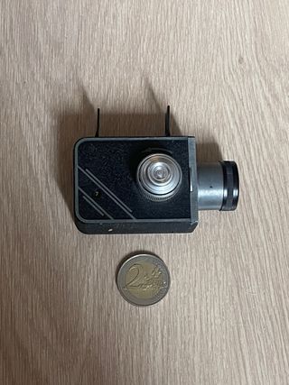 Cámara subminiatura fabricada en Estados Unidos sobre los años 50. Utiliza película de 16mm en cartuchos especiales (incluido). Lente Tynar Anastigmat con apertura f/6.3. Visor desplegable. Cuerpo de metal. En perfecto estado estético, el obturador funciona siempre que se mantenga el trocito de papel que presiona una de las piezas internas (ver foto). El contador de exposiciones va por libre. cámara, cámaras, analógicas, film, antigua, antiguas, antigüedad, coleccion, coleccionismo, coleccionista, pack, lote, oferta, vintage, retro, fotografia, fotos, mini, miniatura, pequeña, analógica, guerra, espía, fotógrafo, clásica