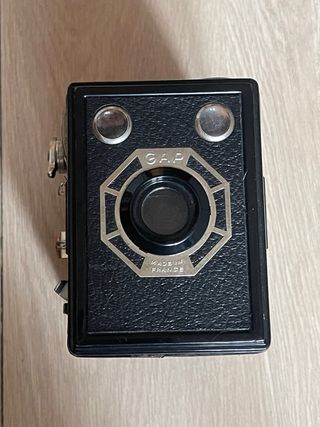 Cámara de cajón tipo Kodak o Agfa de la marca GAP. En buen estado estético, con una de las bobinas en el interior y los visores limpios. Le falta el asa en la parte superior. Funcional en ambas velocidades (instantánea y B). Tiene una pestaña de bloqueo de disparo. cámara, cámaras, analógicas, bobina, film, antigua, antiguas, antigüedad, coleccion, coleccionismo, coleccionista, pack, lote, oferta, vintage, retro, pelicula, fotografia, fotos, foto, fotografo, profesional, original, originales, clásica, clásicas, fotógrafos, analógica, funda, estuche, cuero, piel