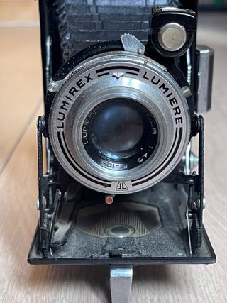 Cámara de fuelle fabricada entre los años 30 y 50 en Francia. Objetivo Lumière Spector f/4.5 de 105 mm. Utiliza película 620. Velocidades entre 1/10 y 1/200 y modos B y T. El fuelle parece en muy buen estado y parece disparar correctamente en todas las velocidades. El temporizador no funciona. Bobina incluida. cámara, cámaras, analógicas, bobina, film, antigua, antiguas, antigüedad, coleccion, coleccionismo, coleccionista, pack, lote, oferta, vintage, retro, pelicula, fotografia, fotos, foto, fotografo, profesional, original, originales, clásica, clásicas, fotógrafos, analógica, funda, estuche, cuero, piel