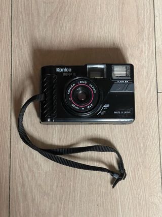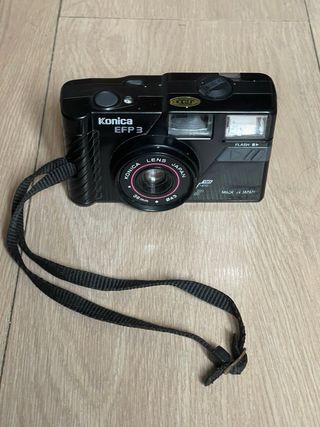 Cámara analógica compacta de tipo point and shoot Konica EFP 3, del año 1987. Utiliza carretes de 35mm y tiene flash integrado. El avance y el disparador funcionan correctamente, y el flash también una vez puestas las pilas (2x AA). En buen estado estético. cámara, cámaras, analógicas, bobina, film, antigua, antiguas, antigüedad, coleccion, coleccionismo, coleccionista, pack, lote, oferta, vintage, retro, pelicula, fotografia, fotos, foto, fotografo, box, caja, cajon, profesional, original, originales, clásica, clásicas, fotógrafos, analógica, funda, estuche, cuero, piel, compactas