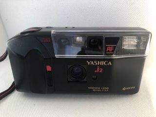 Cámara analógica Yashica con enfoque automático. - Lente Yashica 38mm 1:2.8. - Selector de sensibilidad ISO (DIN/ASA). - Botón de bloqueo de enfoque. La cámara está en buen estado de conservación. Funciona con pilas AA, y el flash también funciona. Se han echado un par de carretes de fotos con ella, aunque a veces la palanca de arrastre se atasca un poco.