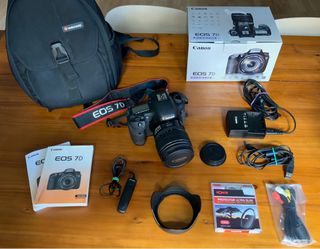 Vendo Canon 7D Mark II + accesorios Tiene sus años pero funciona perfectamente. Muy bien tratada y nunca ha sufrido ningún golpe ni caida. Se puede probar antes de comprar. El precio incluye todo el equipo fotográfico que se ve en la foto general: Cámara Flash Geles de colores para el flash Difusor flash Funda para la lluvia Funda acuatica Mando Adapatadores filtros objetivo Mochila (nueva)