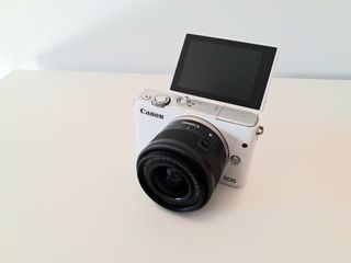 Vendo Cámara Canon EOS M100 en color blanco. Tiene pantalla táctil abatible. Además puedes pasar las imágenes a tu teléfono instantáneamente gracias a su conexión wifi. Incluye: -Cámara Canon EOS M100. -Objetivo EF-M15-45mm f/3.5-6.3 IS STM -Correa de sujeción. -Cargador de batería. -Batería original. - 2 baterías compatibles extra (una completamente nueva). -Mochila para guardarla y transportarla. -Caja original Interfaz USB, Wifi. *La pintura de la parte delantera está mínimamente descorchada, como se aprecia en la foto.