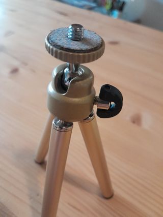 Trípode pequeño de color dorado en buen estado. Ideal para cámaras. - Medidas compactas y ligero de peso. - Material: aluminio y corcho - Tornillo universal para la mayoría de las cámaras. - Medidas: 15 cm alto x 2cm ancho