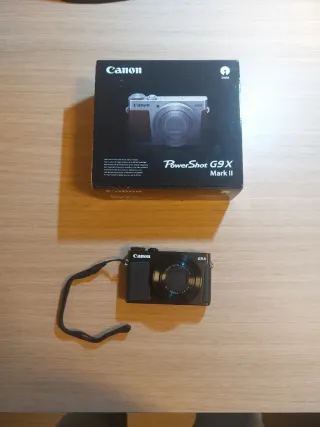 Cámara digital compacta Canon PowerShot G9X Mark II. En perfecto estado, con protector de pantalla, y con DOS baterías originales NB-13L. En su caja, y con todos los accesorios originales. Cámara compacta premium con sensor de 1” y 20,1 MP, ideal para viajes y uso diario. Objetivo 28–84 mm f/2.0–4.9, muy luminosa para su tamaño. Disparo rápido hasta 8,2 fps y grabación Full HD 60p. Pantalla táctil, Wi-Fi, Bluetooth y NFC para pasar fotos al móvil. Muy ligera y de bolsillo (206 g), dispara en RAW y JPEG.