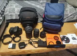 Vendo kit Canon EOS 750D en perfecto estado. Incluye tres objetivos estabilizador. - Cámara réflex Canon EOS 750D. - Objetivo Canon EF-S 18-55mm. - Objetivo Canon EF 50mm. -Objetivo canon EF 24-105. Incluye filtros uv, más filtros densidad neutra+ adaptador de filtros Tiene wifi para enviar fotos y videos. Incluye parasoles para objetivos marca canon, más dos cargadores, correas para colgar y bolsa de transporte de mano, mochila para transportar todo el equipo Todo el equipo comprado en el corte inglés todo con su ticket de compra No se hacen envíos se da en mano y se puede probar sin compromiso, está en muy muy bien cuidado y