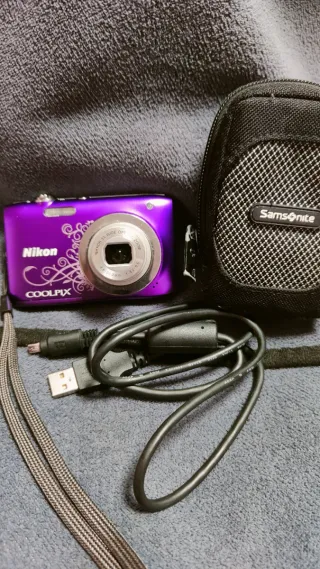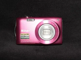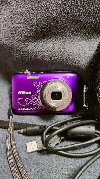 Cámara digital compacta Nikon Coolpix S2600 en color morado. En buen estado estético y totalmente funcional. El único defecto es que le falta una pestaña del objetivo, tal como se ve en la última foto. Más cámaras en mi perfil. - Zoom óptico 5x. - Diseño compacto.