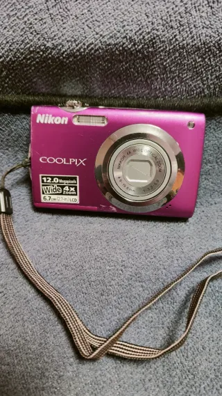 Cámara digital compacta Nikon Coolpix S3000 en color rosa. Captura tus momentos con una resolución de 12.0 megapíxeles y un zoom óptico 4x. En buen estado, con marcas de uso. La cámara funciona bien, pero no siempre enfoca bien y salen las fotos borrosas. Incluye batería y funda. - Pantalla LCD de 6.7 cm (2.7 pulgadas). - Lente NIKKOR 4.9-19.6mm 1:3.2-5.9.