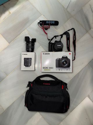 Kit de fotografía y vídeo con cámara réflex digital y accesorios. - Cámara Canon EOS 200D. - Objetivo Canon EF-S 10-18mm f/4.5-5.6 IS STM. - Micrófono RØDE VideoMicro. - Correa para el cuello. - Bolso de transporte Canon. - Funda impermeable. Precio negociable Para más fotos háblame.