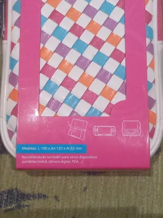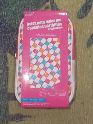 Funda tipo braided case de la marca KAOS, diseñada para consolas portátiles. - Diseño con patrón de rombos en colores pastel. - Cierre de cremallera. - Medidas: 190 x 120 x 23 mm. - Recomendada también para otros dispositivos como móviles, cámaras digitales o PDAs. Toda la info en las fotos. Nueva a estrenar. Tengo otra con el material externo decorativo dañado que si alguien la quiere: la regalo Envío por wallapop y unifico envíos, o recogida en Ourense zona s francisco. No me desplazo. No cambio, no rebajo