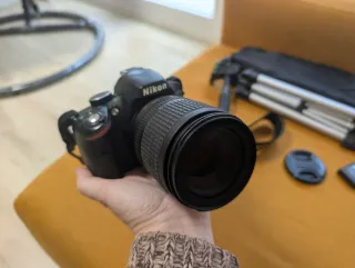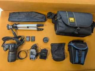 Kit de cámara réflex digital Nikon D3200 con lente AF-S DX 18-105mm. Incluye accesorios para fotografía. - Bolsa de transporte grande. - Bolsa pequeña para accesorios. - Parasol. - Correa para el cuello. - Cargador de batería. - Dos baterías. - Tapa de lente. - Trípode compacto. - Bolsa para trípode. Todo en perfecto estado. A mayores envío la bolsa pequeña que utilizaba para salir a hacer fotos. Esa tiene mucho trote y aunque esta muy desgastada, si la quieres te la envío. Yo la recomiendo para salir a hacer fotos por su comodidad.