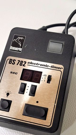 Temporizador electrónico profesional Baeuerle BS 782 en perfecto funcionamiento, ideal para control de ampliadoras y equipos de laboratorio; ofrece programación precisa en segundos mediante display digital, selección de escala ×10/×1/0,1, relé interno para cargas de hasta 880 W, botones de ajuste y disparo muy sensibles, construcción alemana robusta y estable, y estado general muy bueno con leves marcas de uso sin afectar rendimiento. Se vende lo que se ve en las fotos. Mas sobre fotografía analogica en mi perfil #Baeuerle # temporizador # laboratorio # ampliadora # darkroom # analógico # timer # fotografia # 880W # alemania