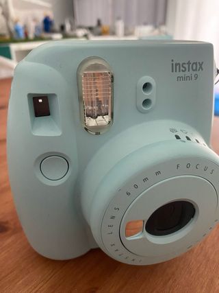 Cámara instantánea Fujifilm Instax Mini 9 en color azul claro, con accesorios. - Funda protectora a juego. - Lentes de colores para efectos creativos. - Marcos decorativos para las fotos.