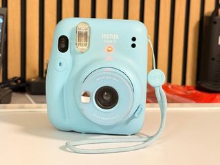 Cámara instantánea Instax Mini 11 en color azul. Perfecta para capturar momentos de forma divertida y obtener fotos al instante. - Incluye correa de mano. - Flash integrado. - Lente de 60mm.