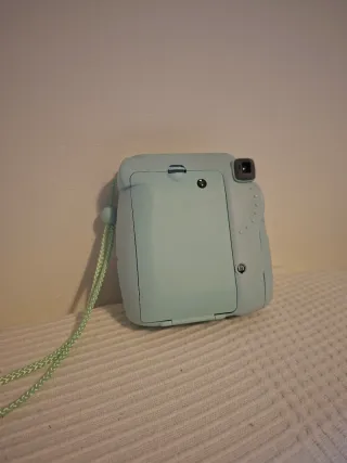 Cámara instantánea Fujifilm Instax Mini 9 en un bonito tono azul verdoso. Incluye su funda protectora a juego y una correa. Funciona perfectamente Con flash Sin film (cartucho con fotos)
